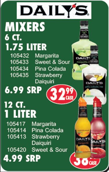 Home / Seasonal Products / Daily’s Mixers Daily’s Mixers Category: Seasonal Products Related products Martinelli’s Apple Sparkling Cider Morton’s Action Melt Salt 25LB Bag Canada Dry Cranberry Ginger Ale Diesel Anti-Gel Power Service